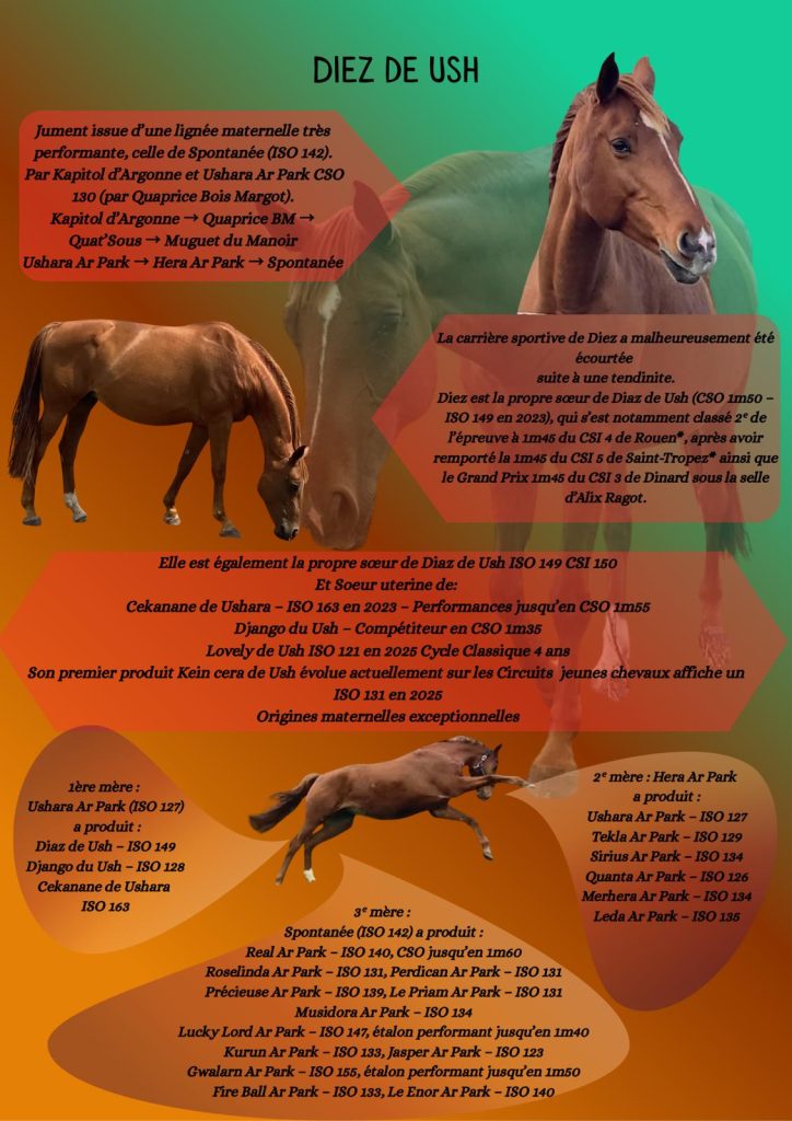 Diez de Ush est une jument issue d’une lignée maternelle d’exception, celle de Spontanée (ISO 142), reconnue pour la qualité et la régularité de sa production.