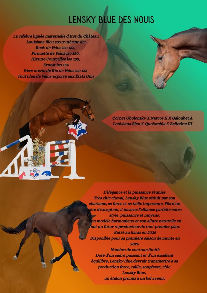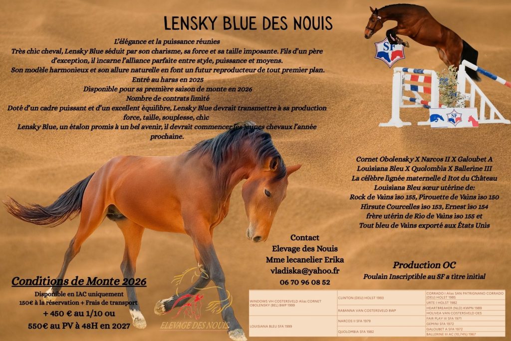 Cheval d’exception au chic remarquable, Lensky Blue séduit par son charisme, sa force et son gabarit imposant.