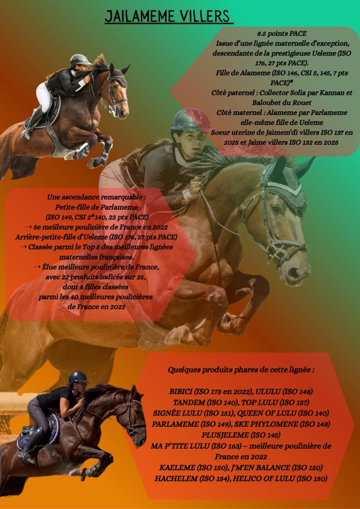 Issue d’une lignée maternelle d’exception, descendante de la prestigieuse Ueleme (ISO 176, 27 pts PACE).